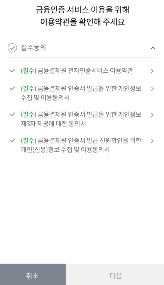 3. 금융인증서 이용에 필요한 약관들이 나타납니다. 내용을 한번 살펴보신 후, 맨 위의 '필수동의'를 체크하여 전체 동의를 하고 다음 단계로 진행합니다.