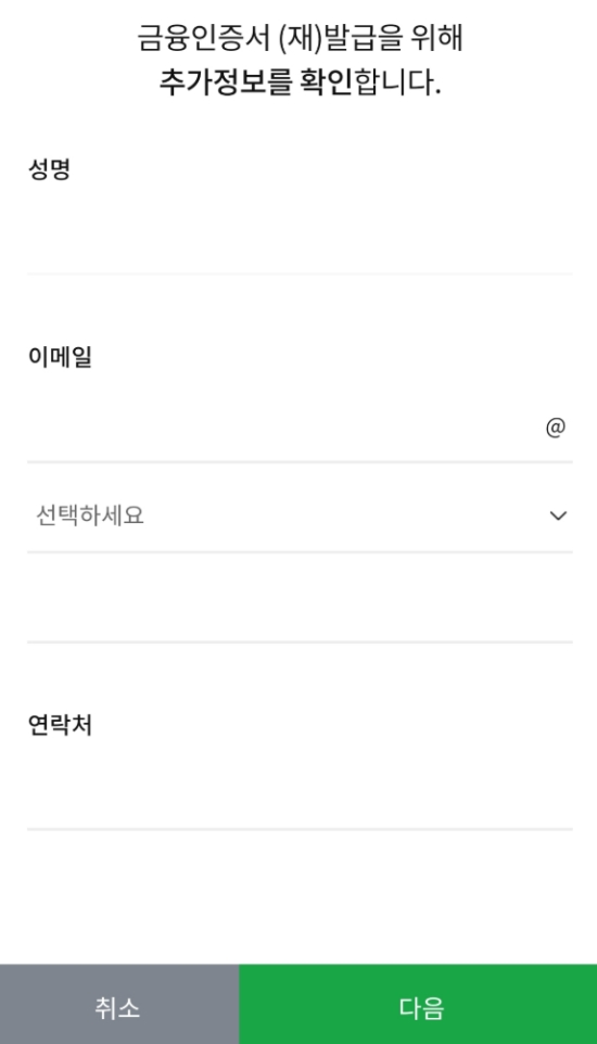 7. 인증서 발급에 필요한 마지막 정보를 기입할 차례입니다. 본인의 이름, 이메일 주소, 그리고 연락처를 각각의 칸에 맞게 차분히 적어주시면 됩니다.
