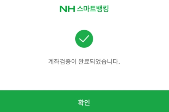5. 입력한 계좌 정보가 정확하다면, 이렇게 계좌 검증이 성공적으로 마무리되었다는 반가운 화면을 보게 됩니다. 이제 '확인'을 눌러 다음으로 나아가세요.