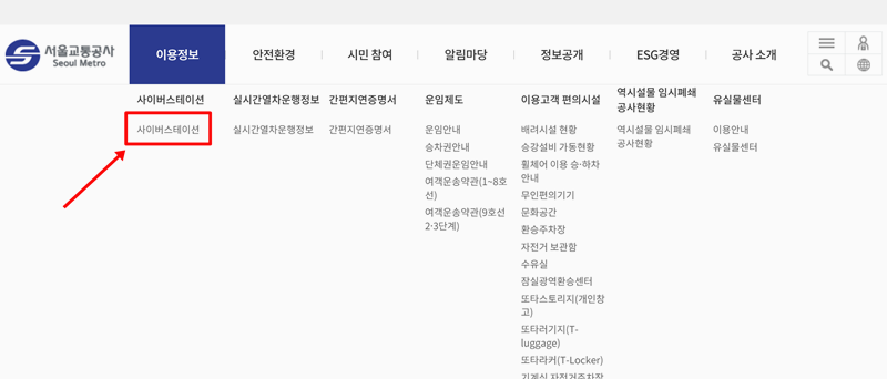 2. '이용정보'를 선택하시면 왼쪽에 여러 항목들이 나타날 거예요. 그중에서 '사이버스테이션'이라는 글자를 선택해 주세요. 여기서는 노선도나 시간표처럼 역과 관련된 중요한 자료들을 확인하실 수 있습니다.