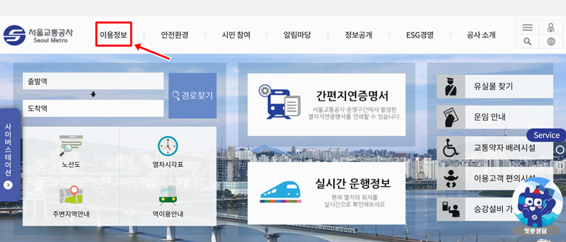 1. 서울교통공사 웹사이트에 들어오시면, 화면 위쪽에 보이는 '이용정보'를 먼저 찾아보세요. 이곳에서 지하철 이용에 필요한 다양한 정보들을 편리하게 살펴보실 수 있습니다.