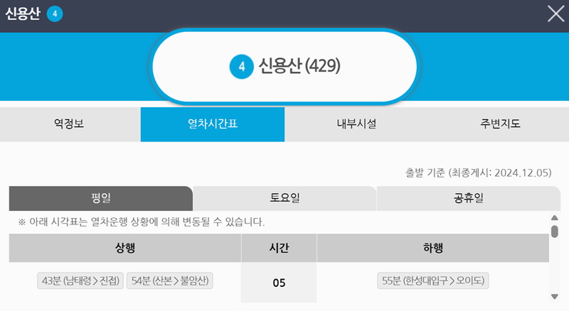 6. 선택하신 역의 상세 화면으로 이동하시면, 위에 '열차시간표'라는 탭이 보이실 거예요. 이곳을 선택하시면 평일, 토요일, 공휴일에 따라 열차가 언제 운행되는지 자세한 시간을 살펴보실 수 있습니다.