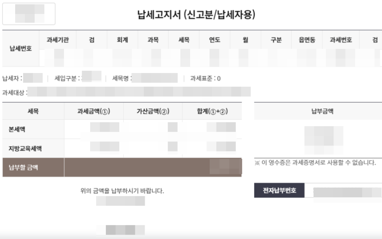 5. 납세고지서에는 납세자 이름, 세입구분, 세목명, 세액과 납부금액이 표시되어 있습니다. 밑에 납부 버튼이 있을텐데 눌러서 납부를 진행하시면 되겠습니다.