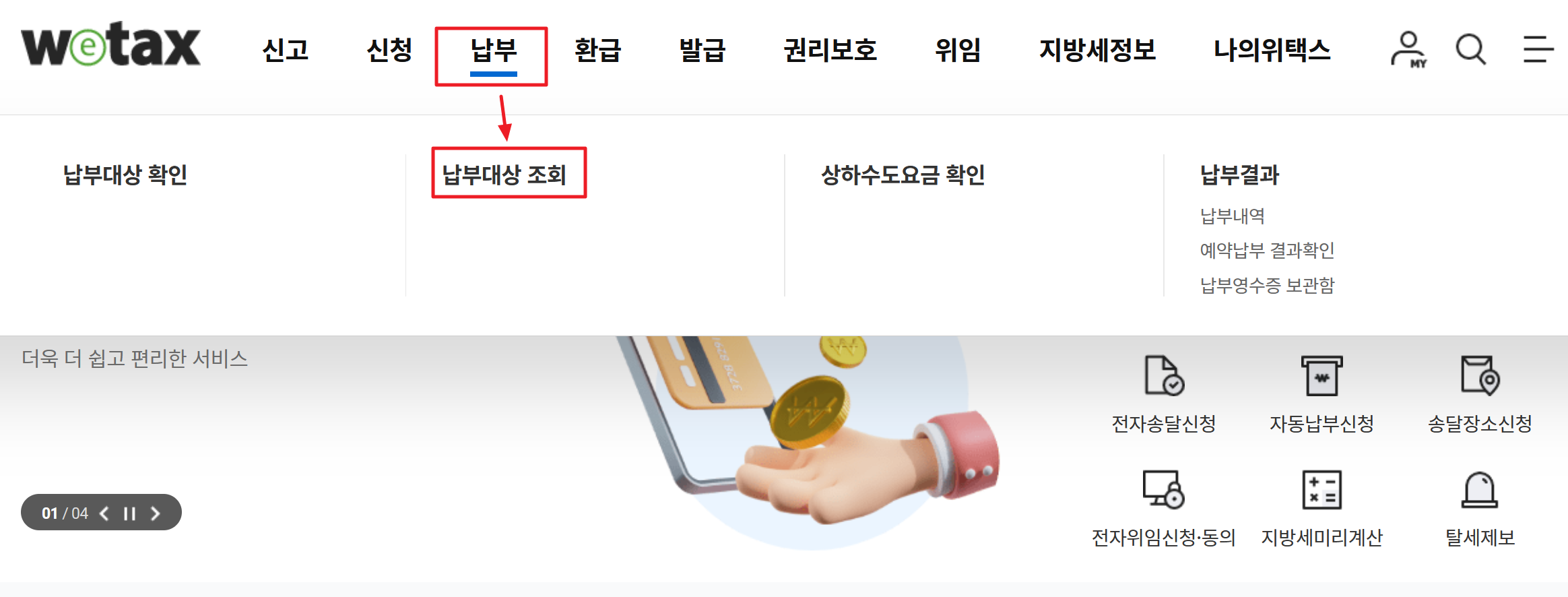 1. 위택스는 지방세 인터넷 납부시스템으로 과세내역확인, 체납확인, 이메일고지 등의 서비스를 제공하고 있습니다. 전자납부 방법은 메뉴에서 납부->납부대상 조회를 눌러줍니다.
