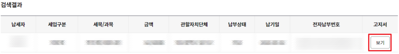 4. 검색 결과에서 미납 된 지방세가 보이면 우측의 고지서 보기가 있습니다. 이걸 눌러 고지서를 열람 해주세요.