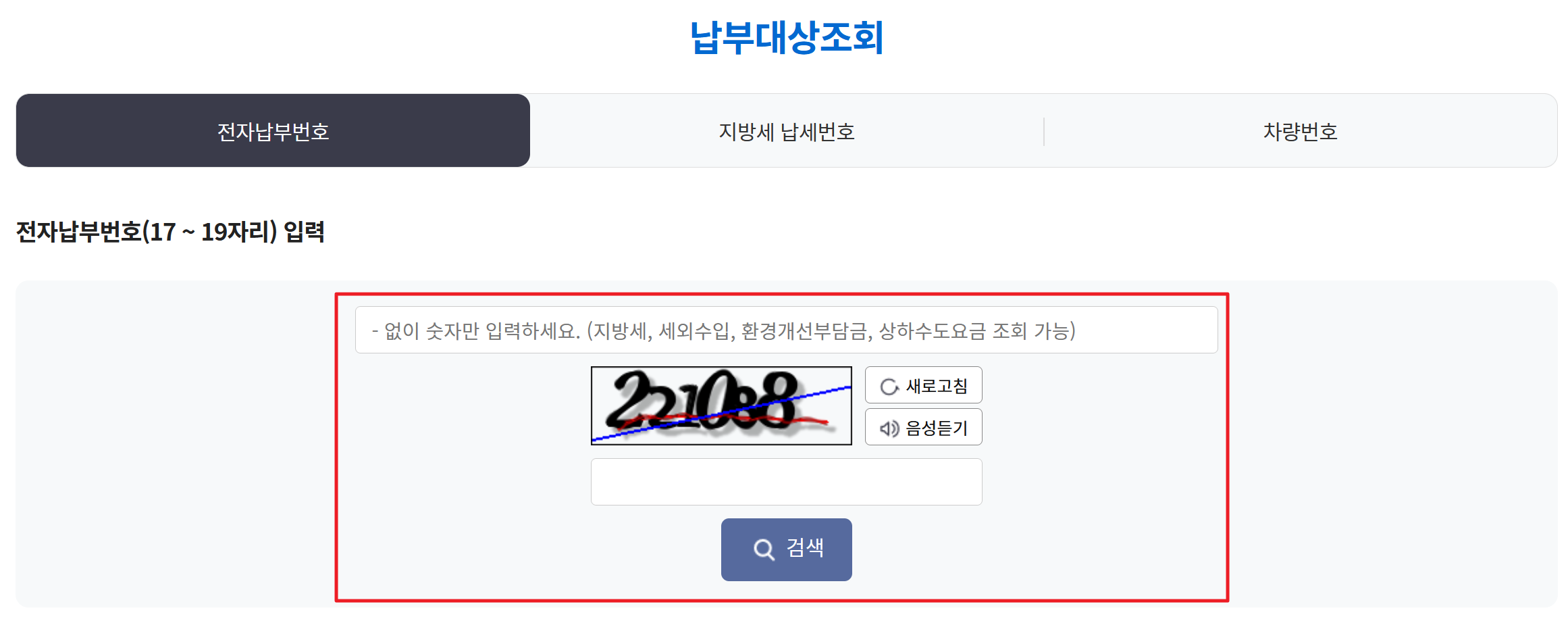 2. 송달받은 우편의 전자납부방법을 가운데 입력하고 검색해줍니다. 자동입력방지도 함께 입력해주세요.