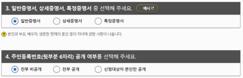 5. 다음으로 증명서에 표시될 정보의 범위를 정합니다. 일반, 상세, 특정 증명서 중 제출할 곳에서 요구하는 종류를 고르고, 주민등록번호 뒷자리를 공개할지 여부도 필요에 맞게 설정해 주세요.