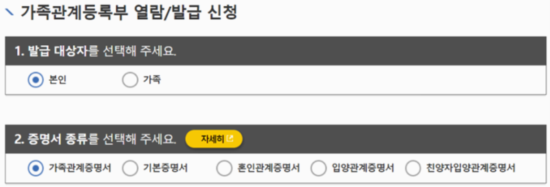 4. 이제 발급할 서류의 세부 내용을 정하는 단계입니다. 먼저 발급 대상자를 본인이나 가족 중에서 고르고, 필요한 증명서의 종류(가족관계증명서 등)를 정확하게 선택해 주세요.
