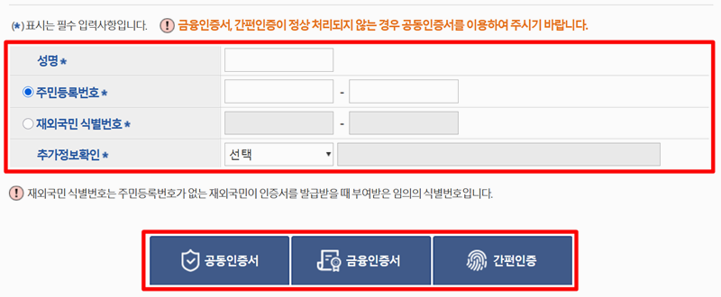 3. 본인 확인을 위해 이름, 주민등록번호와 같은 개인 정보를 입력해야 합니다. 정보를 모두 넣은 후에는 공동인증서, 금융인증서, 간편인증 중에서 본인에게 편한 수단을 골라 인증 절차를 진행하면 돼요.