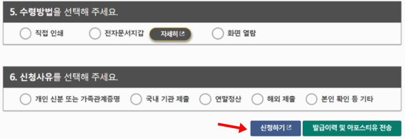 6. 마지막으로 서류를 어떻게 받을지 정하는 단계입니다. 직접 인쇄하거나 전자문서지갑으로 받을 수 있어요. 신청 사유를 간단히 고른 뒤 '신청하기'를 누르면 모든 과정이 마무리됩니다.