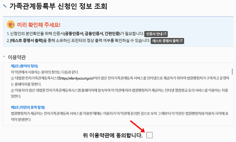 2. 증명서 발급을 시작하기 전에 이용약관을 확인하는 페이지가 나옵니다. 내용을 살펴보고 화면 아래쪽에 있는 '위 이용약관에 동의합니다' 부분에 체크해 주세요.