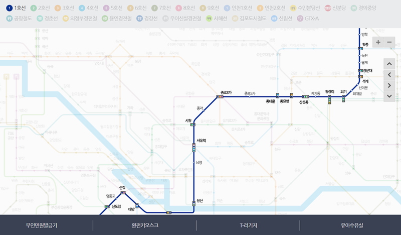 4. 많은 노선 중에서 내가 이용할 1호선을 선택하면, 다른 선들 사이에서 해당 경로가 진한 파란색으로 뚜렷하게 표시되어 전체적인 동선을 파악하기 좋습니다.