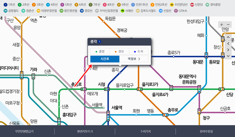 5. 노선도 위에서 종각역처럼 궁금한 역을 선택하면 작은 정보창이 나타납니다. 여기서 '시간표' 부분을 누르면 해당 역의 상세한 열차 운행 시각을 확인할 수 있어요.