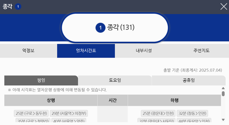 6. 시간표 화면으로 들어오면 평일, 토요일, 공휴일로 나누어 첫차부터 막차까지의 운행 시각을 자세히 볼 수 있습니다. 상행과 하행 시간도 모두 나와 있어 계획을 짜기 편해요.