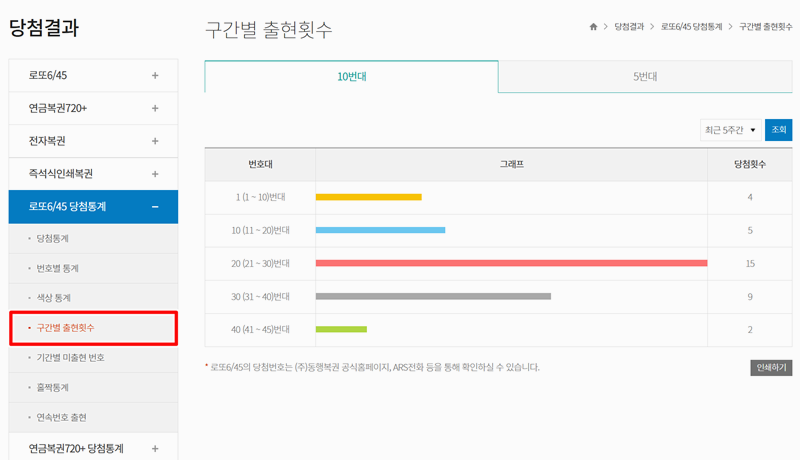 7. '구간별 출현횟수'는 1번부터 10번, 11번부터 20번처럼 번호를 구간으로 나누어 어떤 번호대에서 당첨 번호가 가장 많이 나왔는지 보여주는 통계 자료입니다.