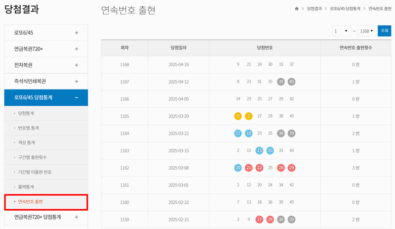 8. '연속번호 출현' 통계도 흥미로운 정보예요. 각 회차마다 15와 16처럼 나란히 이웃한 번호가 몇 쌍이나 함께 나왔는지 기록을 통해 살펴볼 수 있습니다.