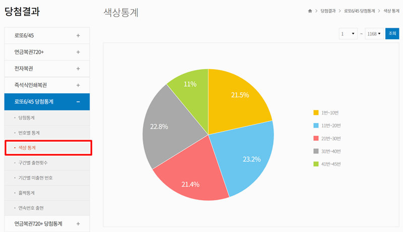 6. 왼쪽 메뉴에서 '색상 통계'를 보는 것도 또 다른 재미예요. 노란색, 파란색 등 번호대별로 다른 공의 색깔이 얼마나 고르게 나왔는지 원그래프로 쉽게 파악할 수 있습니다.