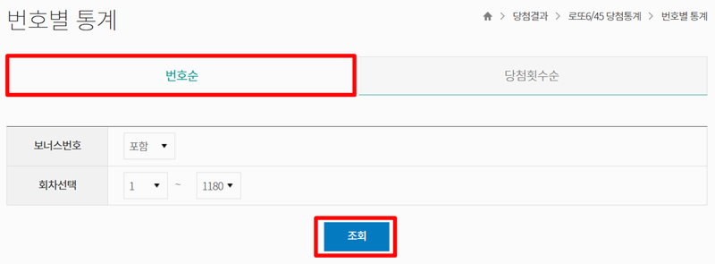 3. '번호별 통계' 페이지에서는 기본적으로 번호 순서대로 정렬된 통계를 볼 수 있습니다. 원하는 회차 구간을 설정한 뒤 '조회'를 누르면 해당 기간의 자료가 나타나요.