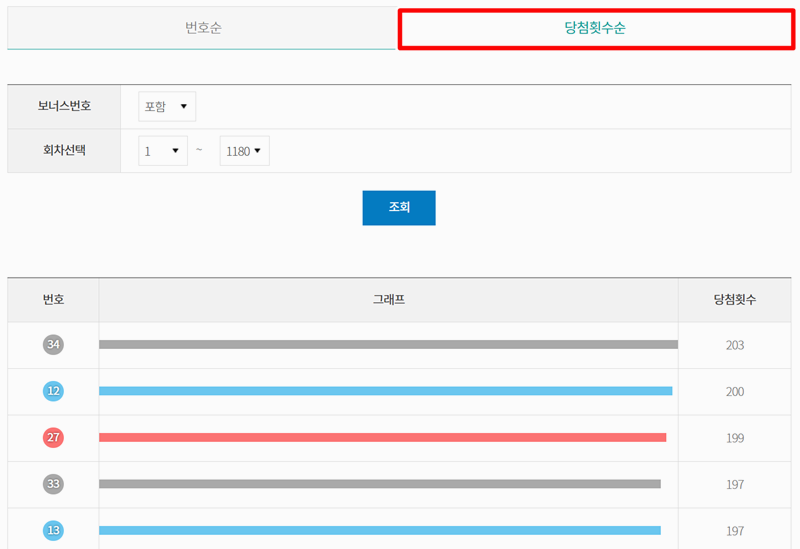 5. 만약 가장 많이 나온 숫자 순서대로 보고 싶다면, 상단의 '당첨횟수순'을 선택하면 됩니다. 가장 인기가 많았던 행운의 숫자부터 차례대로 정렬된 결과를 확인할 수 있어요.