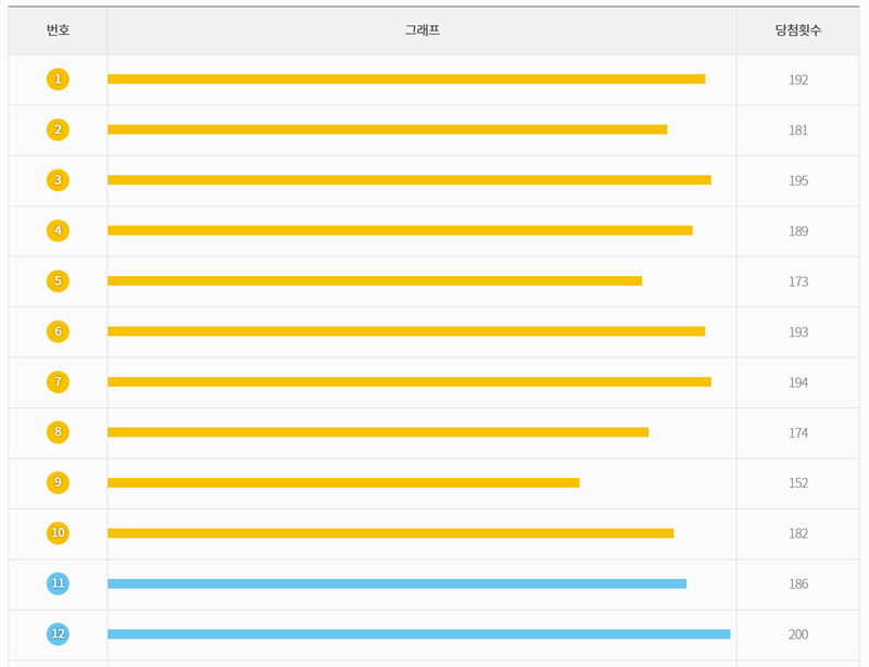 4. 조회 결과 화면에서는 1번부터 45번까지 각 숫자가 총 몇 번이나 당첨 번호로 나왔는지 막대그래프와 함께 표시됩니다. 숫자들이 걸어온 길을 한눈에 볼 수 있죠.