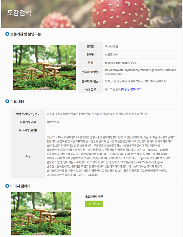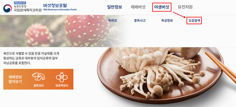1. 농촌진흥청 국립원예특작과학원에서 운영하는 '버섯정보포털' 사이트에 접속하면, 상단 메뉴에서 '야생버섯'을 볼 수 있습니다. 여기서 '도감검색'으로 들어가면 버섯 정보를 찾아볼 수 있어요.