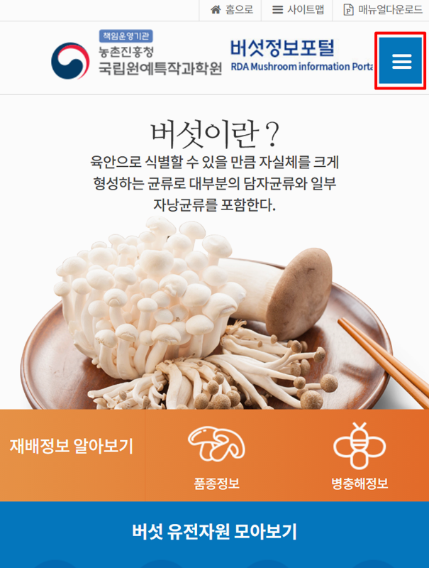 7. 스마트폰으로 접속했을 때는 오른쪽 위에 있는 메뉴를 열어 '야생버섯'이나 '유전자원' 같은 원하는 항목으로 바로 이동하여 편리하게 이용할 수 있습니다.