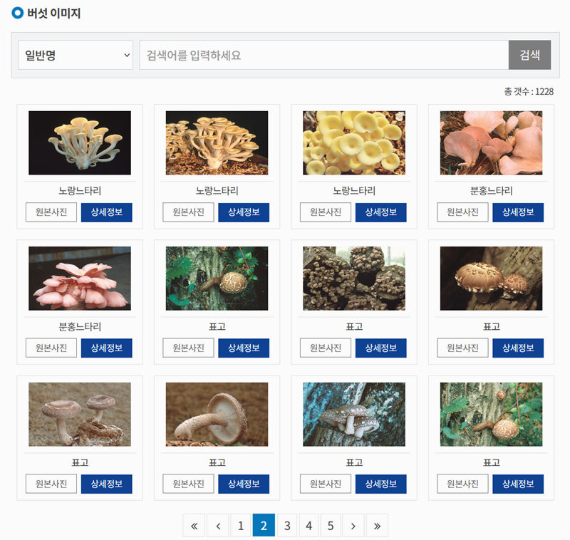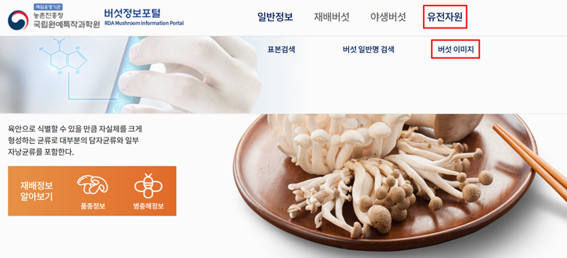 5. 버섯의 모습만 알고 이름은 모를 때는 '유전자원' 메뉴의 '버섯 이미지' 항목을 활용해 보세요. 사진을 보며 내가 찾던 버섯의 이름을 알아낼 수 있습니다.