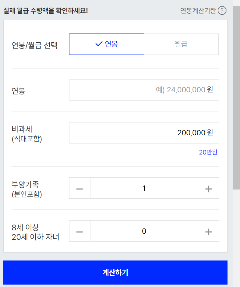 4. 이제 연봉 실수령액 계산기를 이용 해볼 수 있습니다. 연봉/월급 선택이 가능하고 연봉, 비과세 금액, 부양가족, 8세이상 20세이하 자녀를 선택하고 계산을 해보세요.