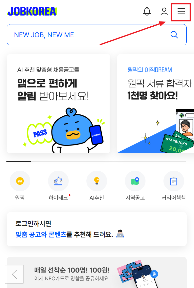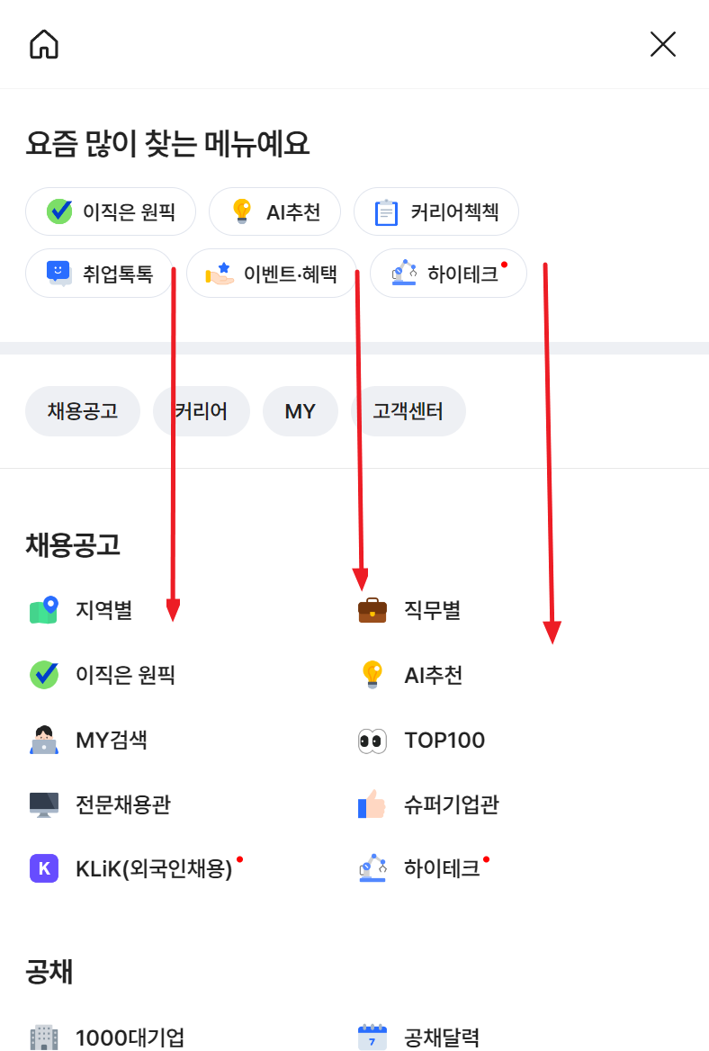 2. 메뉴가 열리면 여러가지 채용공고, 공채 등이 보이는데 스크롤을 아래로 쭉 내려봅니다.