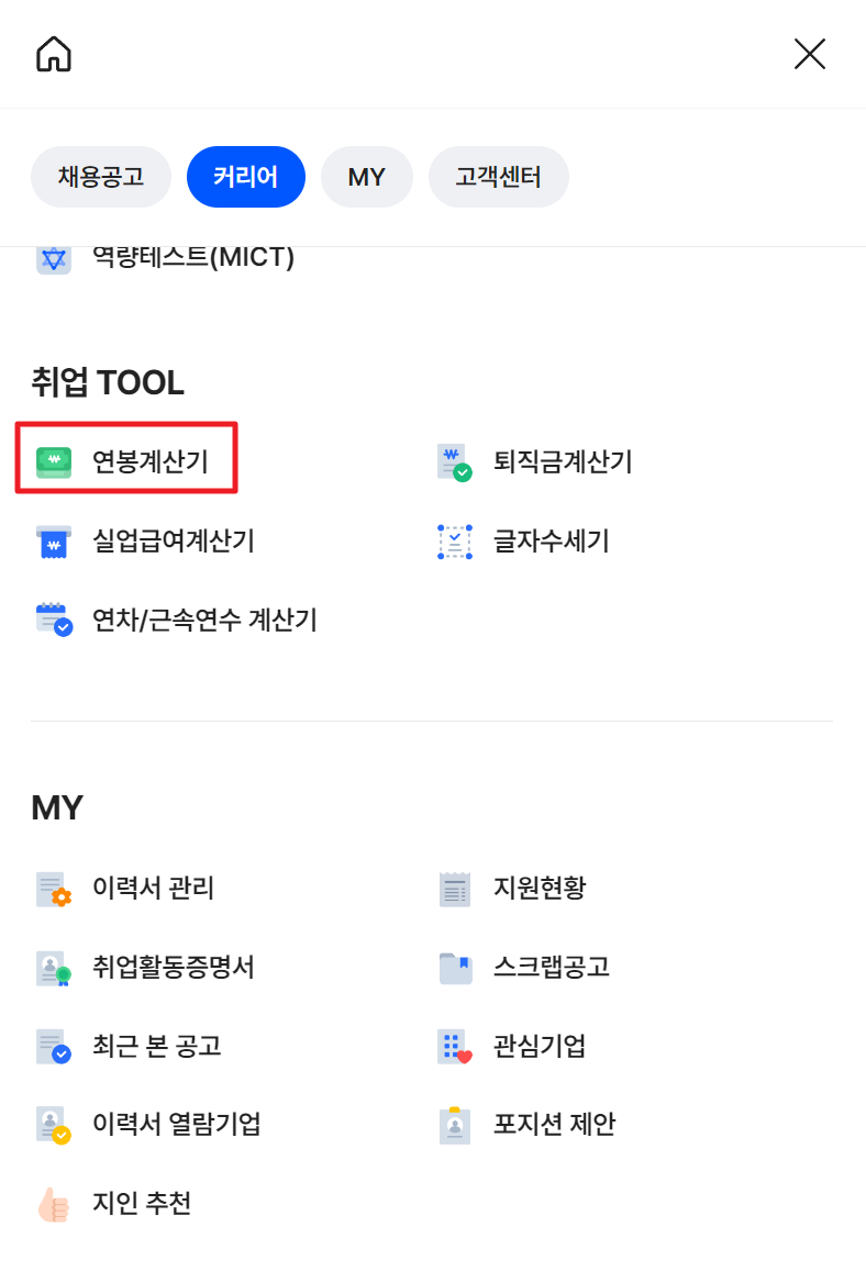 3. 취업 TOOL에서 연봉, 퇴직금, 실업급여, 연차/근속연수 계산기와 글자수세기 도구 등이 있습니다. 연봉계산기를 선택해주세요.