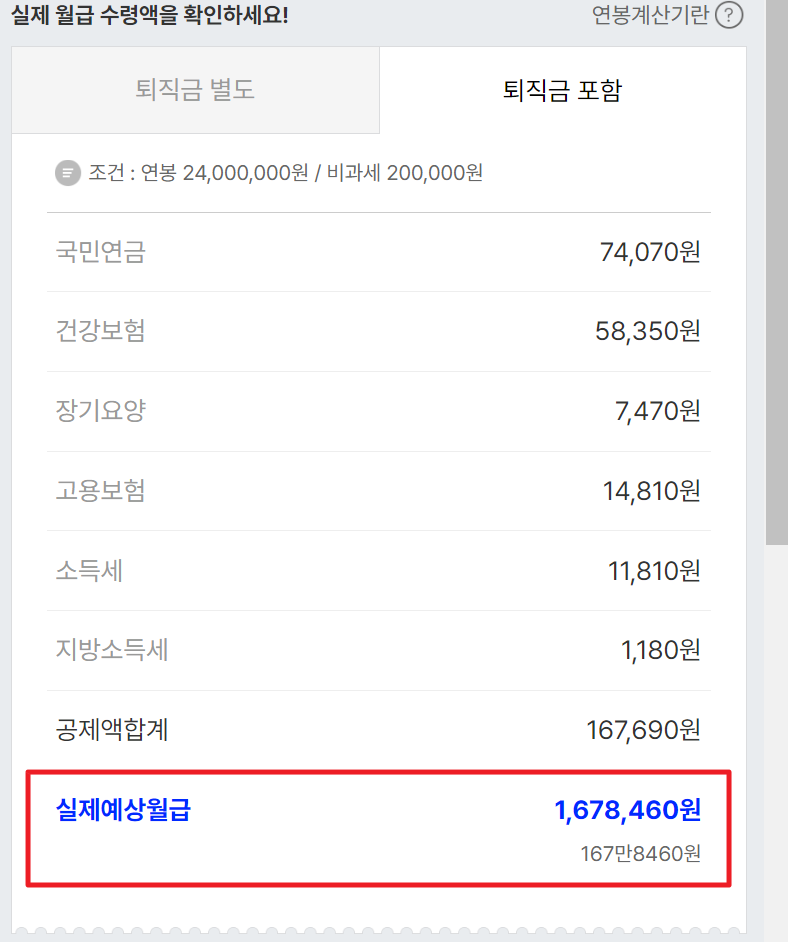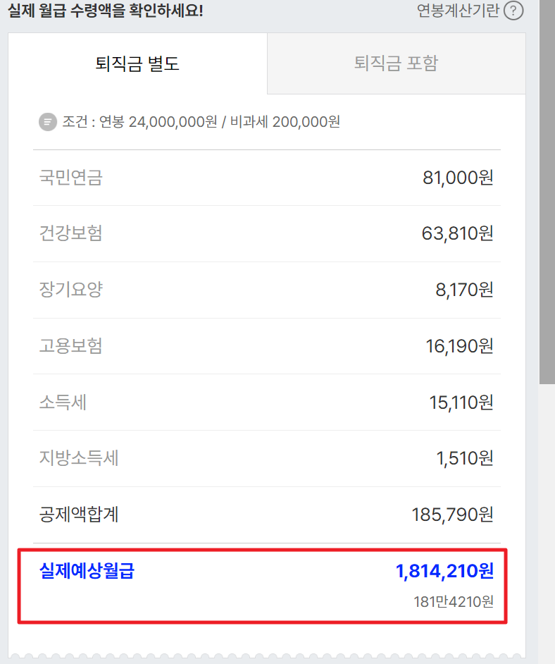 5. 계산 결과가 나오면 각종 공제 내역과 함께 실제 예상 월급이 나옵니다. 24,000,000원의 연봉으로 계산 했을 때에 실제예상월급이 1,814,210원이라는 결과가 나왔으며 퇴직금 포함과 별도로 계산이 가능합니다. 여기서 월급을 x12를하면 대략적인 연봉을 알아볼 수 있겠습니다.