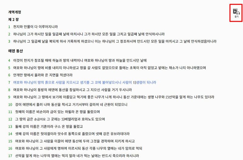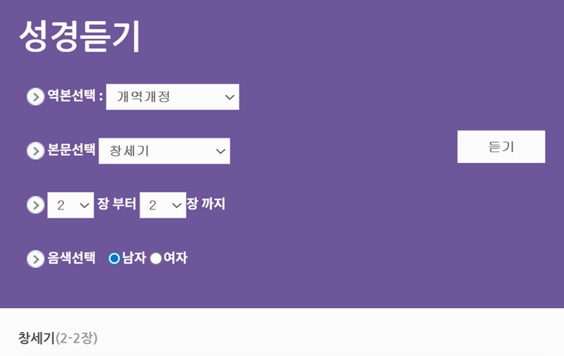 6. 단순히 읽는 것을 넘어, 성경을 음성으로 들을 수도 있습니다. 원하는 책과 장, 그리고 음색을 고른 뒤 '듣기'를 선택하면 편안하게 말씀을 들을 수 있습니다.