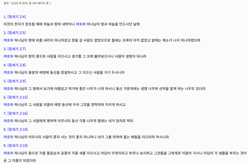 4. 검색을 마치면, 입력한 단어가 포함된 모든 구절이 성경책 순서대로 목록으로 나타납니다. 여기서 마음에 드는 구절을 쉽게 찾아볼 수 있습니다.