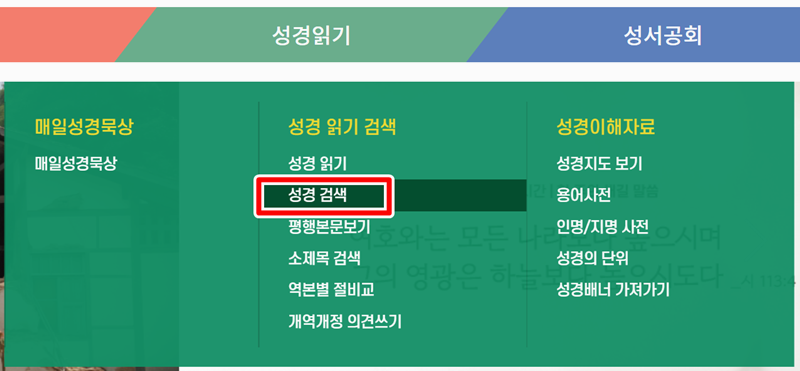 2. '성경읽기' 메뉴를 선택하면 다양한 항목이 나타납니다. 이 중에서 특정 단어나 구절을 찾기 위해 '성경 검색'으로 들어갑니다.
