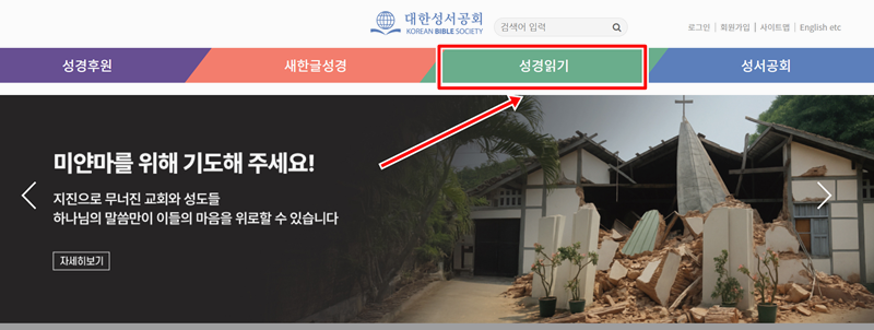 1. 대한성서공회 홈페이지에 방문하여, 상단 메뉴 중 '성경읽기'를 찾아 선택하는 것으로 말씀 여정을 시작할 수 있습니다.