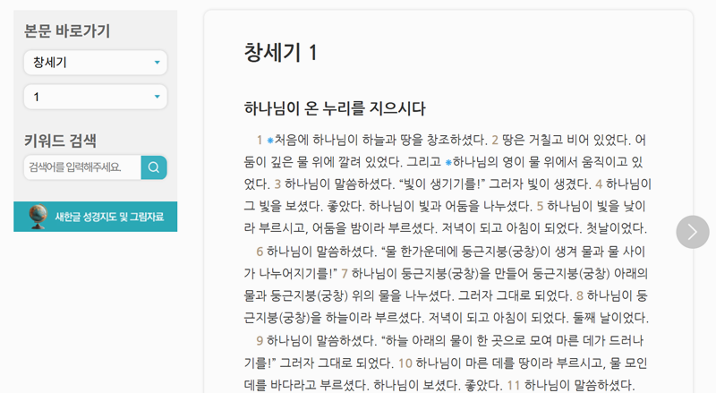 8. 새한글성경 읽기 화면은 현대적인 문체로 되어 있어 이해하기가 한결 수월합니다. 왼쪽에서 원하는 책과 장을 바로 선택하여 이동할 수도 있어 편리합니다.