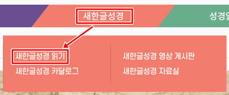 7. 다른 번역본을 보고 싶다면, 상단 메뉴의 '새한글성경'을 선택해 보세요. 이어서 '새한글성경 읽기'로 들어가면 현대적인 번역으로 말씀을 접할 수 있습니다.