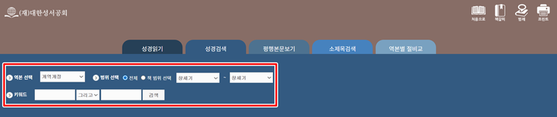 3. 검색 화면에서 원하는 성경 버전과 범위를 정할 수 있습니다. 그리고 찾고 싶은 단어를 '키워드' 칸에 입력한 뒤 찾아보면 됩니다.