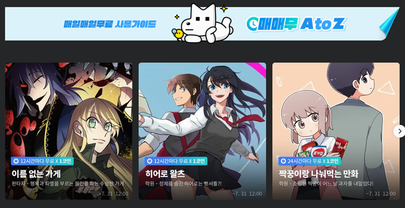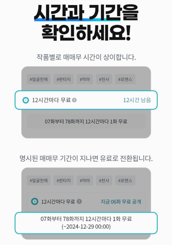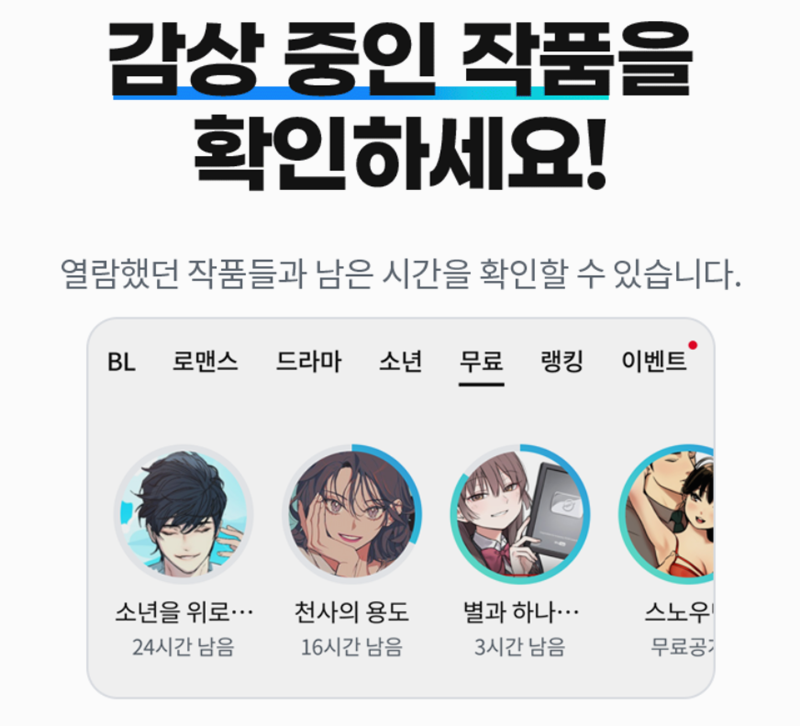 2. 이곳에서는 '12시간마다 무료' 또는 '24시간마다 무료'처럼 일정 시간을 기다리면 다음 화가 열리는 작품들이 모여 있습니다.