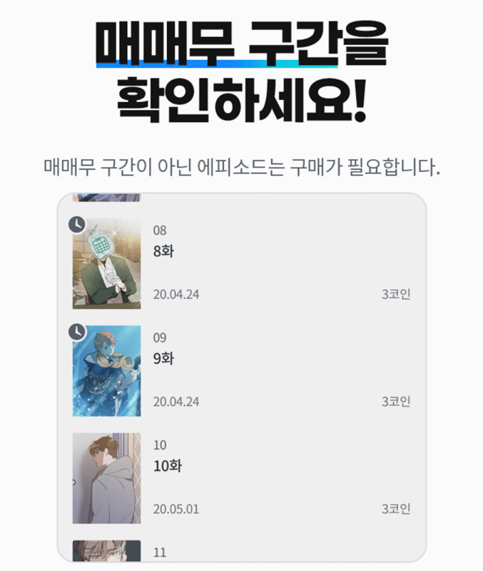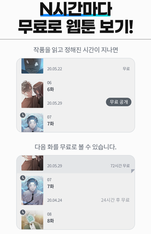 6. 작품에 따라 다음 화가 열리는 시간과 무료로 볼 수 있는 기간이 다르니, 남은 시간과 적용되는 회차를 확인해두면 좋습니다.