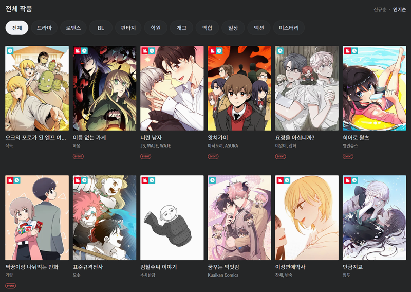 3. 전체 작품 목록에서 드라마, 로맨스, 판타지 등 원하는 장르를 선택해 보세요. 자신의 취향에 맞는 이야기들을 더 쉽게 찾을 수 있습니다.