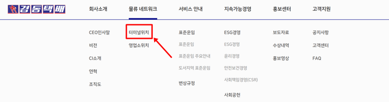 5. 일반적인 지점이 아닌, 대규모 물류 허브인 터미널의 위치가 궁금하다면 다른 경로로 확인할 수 있습니다. '물류 네트워크' 메뉴 아래에서 '영업소위치'가 아닌 '터미널위치'를 선택해 주세요. 이곳에서는 일반 접수처와는 다른, 물류의 중심 거점 정보를 안내합니다.