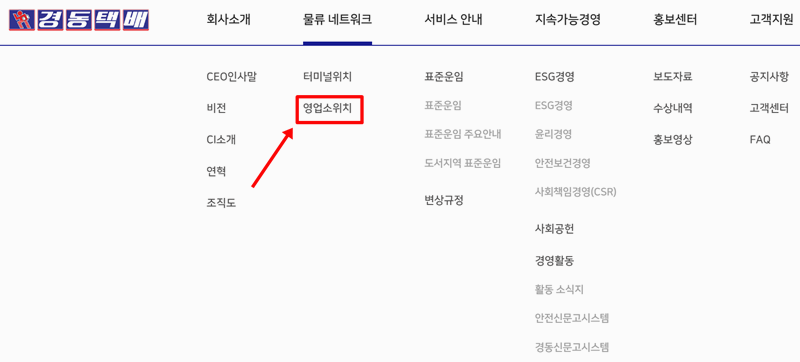 2. '물류 네트워크'에 마우스를 올리거나 선택하면 아래로 몇 가지 세부 목록이 나타납니다. 여러 항목 중에서 우리가 찾으려는 '영업소위치'가 보일 거예요. 전국의 모든 지점 정보를 확인하기 위해 이 부분을 눌러 다음 단계로 이동합니다.