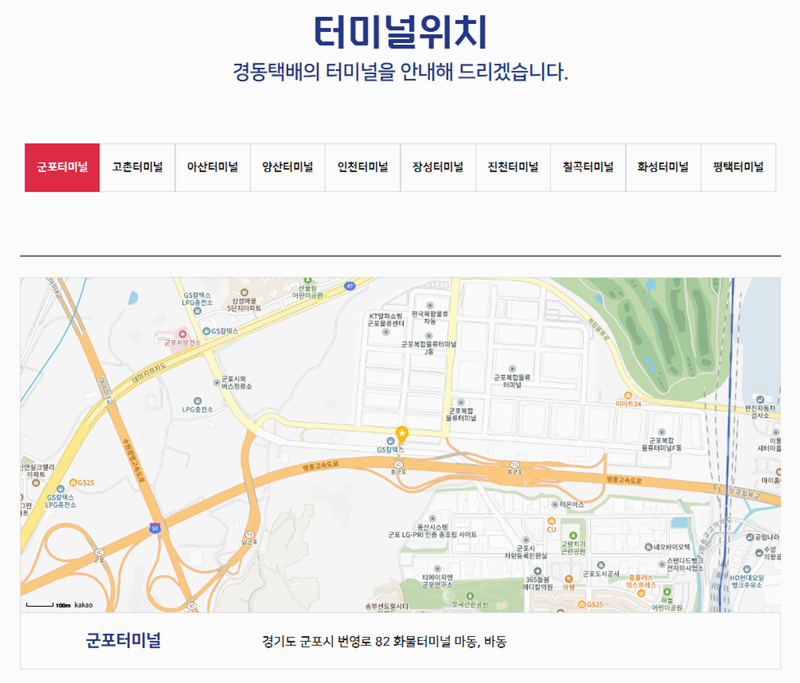6. '터미널위치'를 선택하면 전국의 주요 터미널 목록과 위치가 지도로 나타납니다. 군포터미널, 고촌터미널 등 각 지역의 중심 터미널이 탭으로 구분되어 있어요. 지도와 함께 정확한 주소도 나와 있어 물류 이동의 핵심이 되는 곳들의 위치를 쉽게 찾을 수 있습니다.