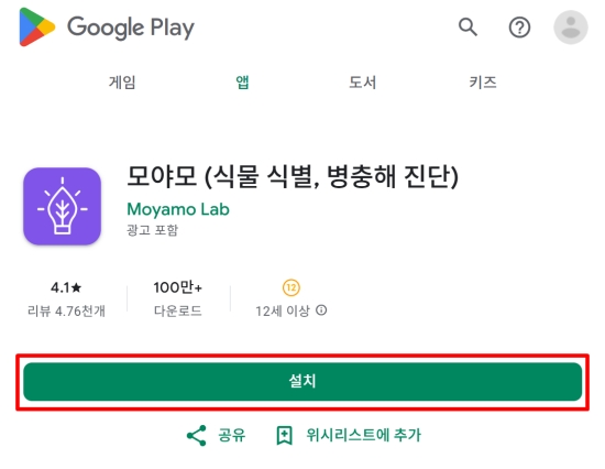 1. 구글 플레이스토어에서 '모야모'를 검색한 뒤 '설치'를 선택하여 앱을 내려받습니다. 이 앱은 식물의 이름을 찾아주는 것은 물론, 식물이 아플 때 원인을 진단해 주는 기능도 갖추고 있습니다. 많은 사람이 사용하며 남긴 평가도 볼 수 있어 믿고 이용할 수 있습니다.