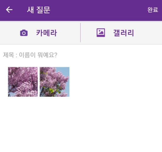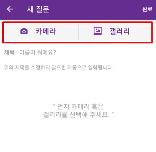 3. 질문을 작성하는 화면에서는 이름을 알고 싶은 식물의 사진을 먼저 올려야 합니다. '카메라'를 골라 그 자리에서 바로 식물 사진을 찍을 수도 있고, '갤러리'를 골라서 이전에 찍어두었던 사진을 불러와 사용할 수도 있어 편리합니다.