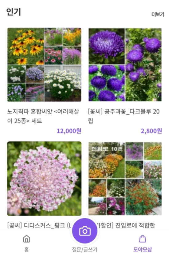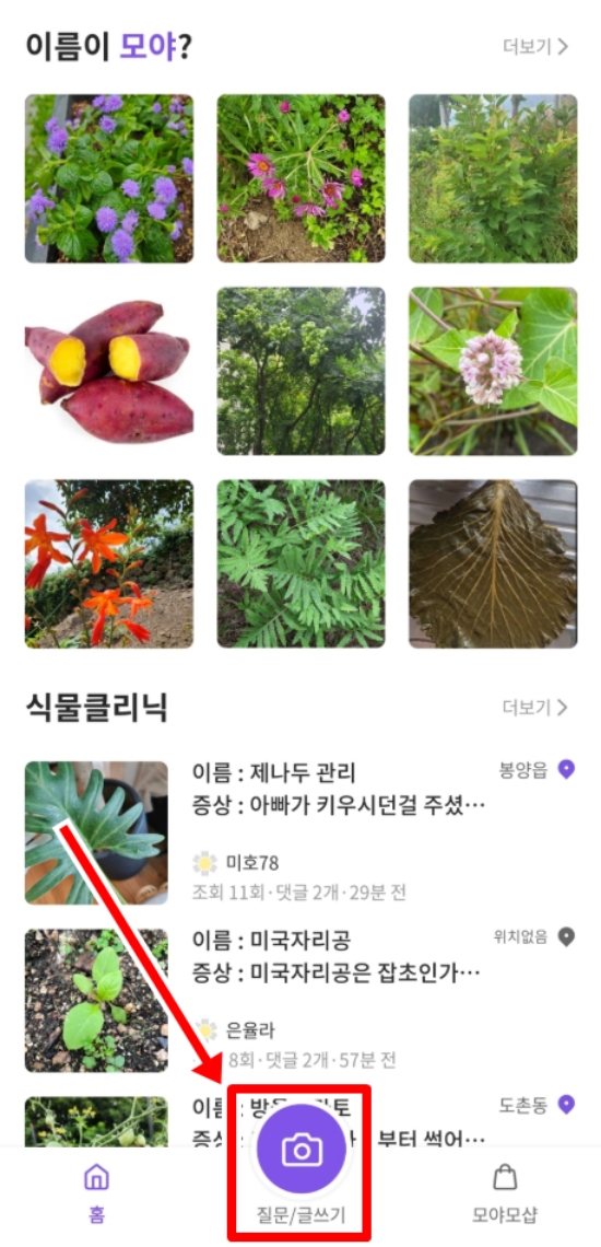 2. 앱을 실행하면 다른 사람들이 올린 다양한 식물 사진과 질문이 가득한 첫 화면이 나타납니다. 여기서 내 식물의 이름이 궁금하다면 화면 아래쪽 중앙에 있는 보라색 카메라 모양의 '질문/글쓰기' 부분을 선택해 새로운 질문을 시작할 수 있습니다.