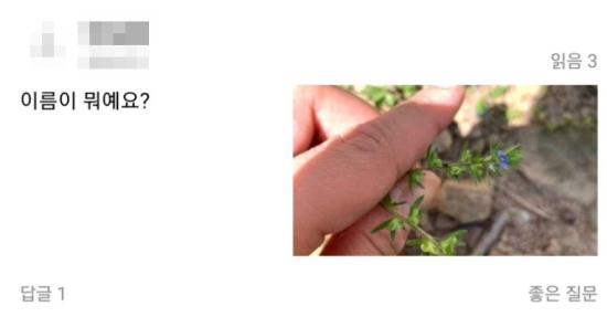 6. 다른 사람이 올린 질문의 예시를 보면, 식물의 특징이 잘 드러나도록 사진을 찍어 올린 것을 알 수 있습니다. 이렇게 작은 들꽃이라도 가까이에서 선명하게 찍어 질문하면, 다른 사람들이 답변하기가 훨씬 수월해집니다.