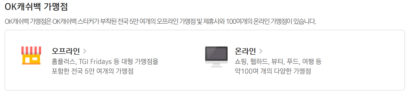 3. 가맹점은 5만개 이상의 오프라인, 온라인 가맹점이 있습니다. 스티커가 부착이 되어있는 곳이면 모두 이용 할 수 있는데요. 홈플러스, TGI Fridays 대형 마켓, 음식점에서 이용 할 수 있으며 쇼핑, 뷰티, 푸드, 여행 점 온라인에서도 쓸 수 있습니다.