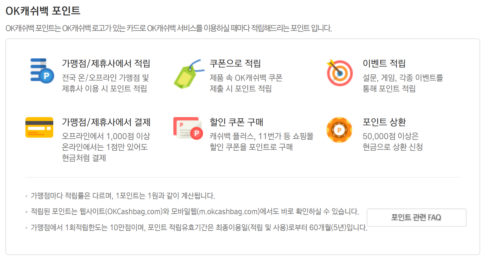 2. 자세한 적립 방법도 살펴볼 수 있었습니다. 가맹점/제휴사에서 적립과 결제가 가능하고 제품 속 쿠폰으로 포인트가 적립되거나 설문, 게임, 각종 이벤트로도 적립을 받을 수 있습니다. 포인트 상환은 50,000점 이상이면 현금으로 상환 할 수 있습니다.